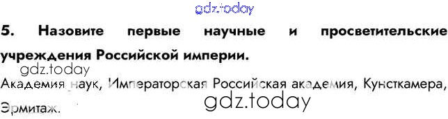 На страницах сайта gdz.today вы найдете учебный и вспомогательный материал, направленный на улучшения знаний школьной программы. ГДЗ - онлайн мир знаний Вопросы и задания Российская наука и техника в XVIII в. 5 Учебнику по Истории России для 8 класса Арсентьев, Курукин Просвещение 2016