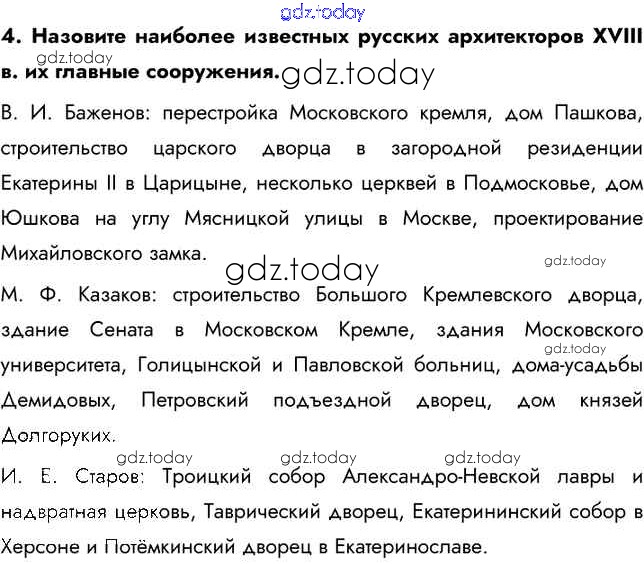 На страницах сайта gdz.today вы найдете учебный и вспомогательный материал, направленный на улучшения знаний школьной программы. ГДЗ - онлайн мир знаний Вопросы и задания Русская архитектура XVIII в. 4 Учебнику по Истории России для 8 класса Арсентьев, Курукин Просвещение 2016