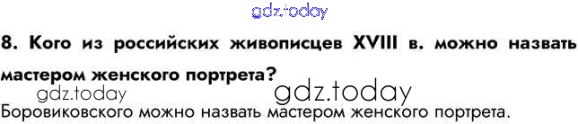 На страницах сайта gdz.today вы найдете учебный и вспомогательный материал, направленный на улучшения знаний школьной программы. ГДЗ - онлайн мир знаний Вопросы и задания Живопись и скульптура 8 Учебнику по Истории России для 8 класса Арсентьев, Курукин Просвещение 2016