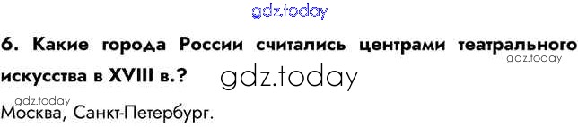 На страницах сайта gdz.today вы найдете учебный и вспомогательный материал, направленный на улучшения знаний школьной программы. ГДЗ - онлайн мир знаний Вопросы и задания Музыкальное и театральное искусство 6 Учебнику по Истории России для 8 класса Арсентьев, Курукин Просвещение 2016
