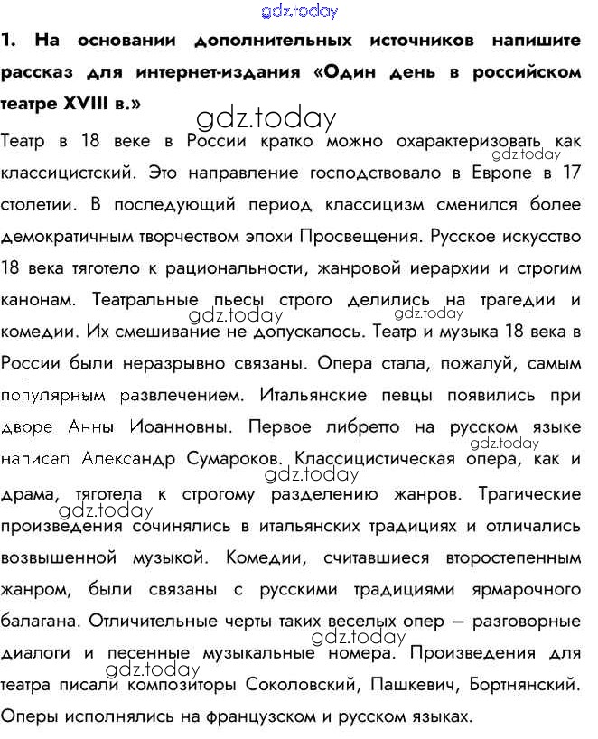 На страницах сайта gdz.today вы найдете учебный и вспомогательный материал, направленный на улучшения знаний школьной программы. ГДЗ - онлайн мир знаний Думаем, сравниваем, размышляем Музыкальное и театральное искусство 1 Учебнику по Истории России для 8 класса Арсентьев, Курукин Просвещение 2016