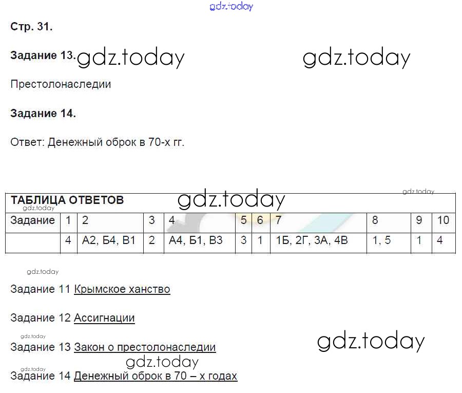 На страницах сайта gdz.today вы найдете учебный и вспомогательный материал, направленный на улучшения знаний школьной программы. ГДЗ - онлайн мир знаний Страницы (решение) 31 Контрольным работам по Истории России для 8 класса Артасов Просвещение УМК 2016
