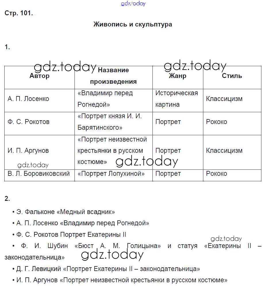 На страницах сайта gdz.today вы найдете учебный и вспомогательный материал, направленный на улучшения знаний школьной программы. ГДЗ - онлайн мир знаний Страницы (решение) 101 Рабочей тетради по Истории России для 8 класса Артасов, Данилов Просвещение УМК 2016