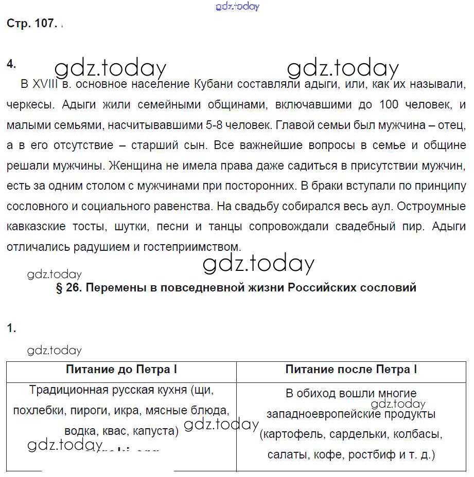 На страницах сайта gdz.today вы найдете учебный и вспомогательный материал, направленный на улучшения знаний школьной программы. ГДЗ - онлайн мир знаний Страницы (решение) 107 Рабочей тетради по Истории России для 8 класса Артасов, Данилов Просвещение УМК 2016
