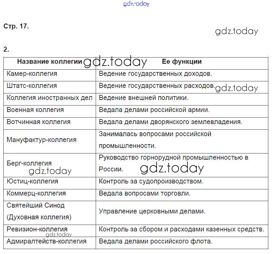 На страницах сайта gdz.today вы найдете учебный и вспомогательный материал, направленный на улучшения знаний школьной программы. ГДЗ - онлайн мир знаний Страницы (решение) 17 Рабочей тетради по Истории России для 8 класса Артасов, Данилов Просвещение УМК 2016