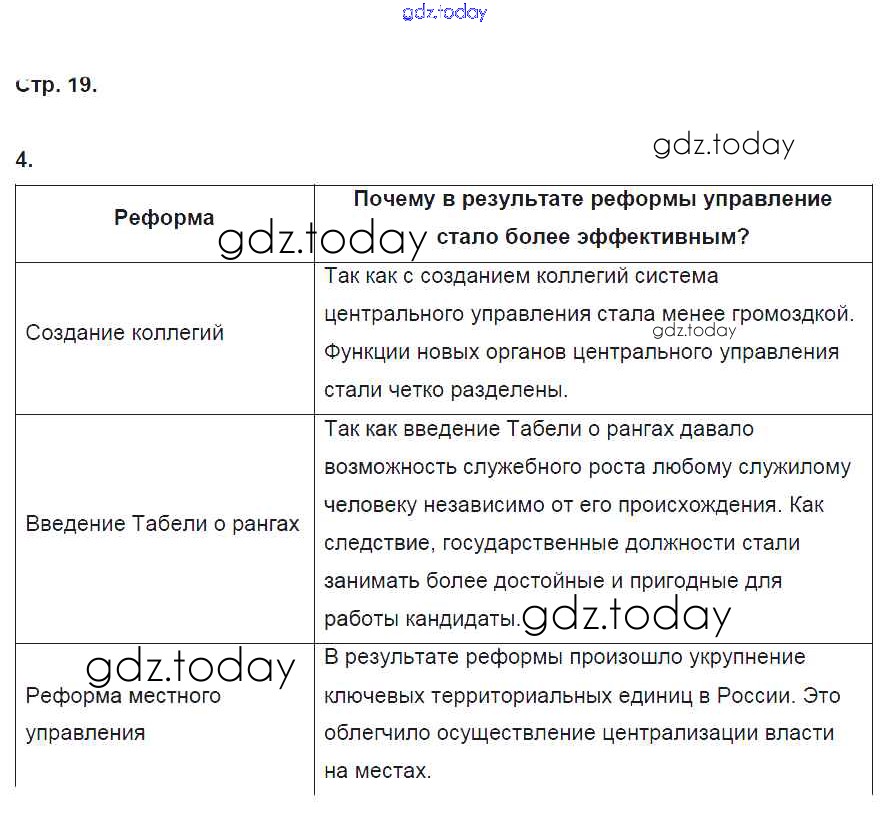 На страницах сайта gdz.today вы найдете учебный и вспомогательный материал, направленный на улучшения знаний школьной программы. ГДЗ - онлайн мир знаний Страницы (решение) 19 Рабочей тетради по Истории России для 8 класса Артасов, Данилов Просвещение УМК 2016
