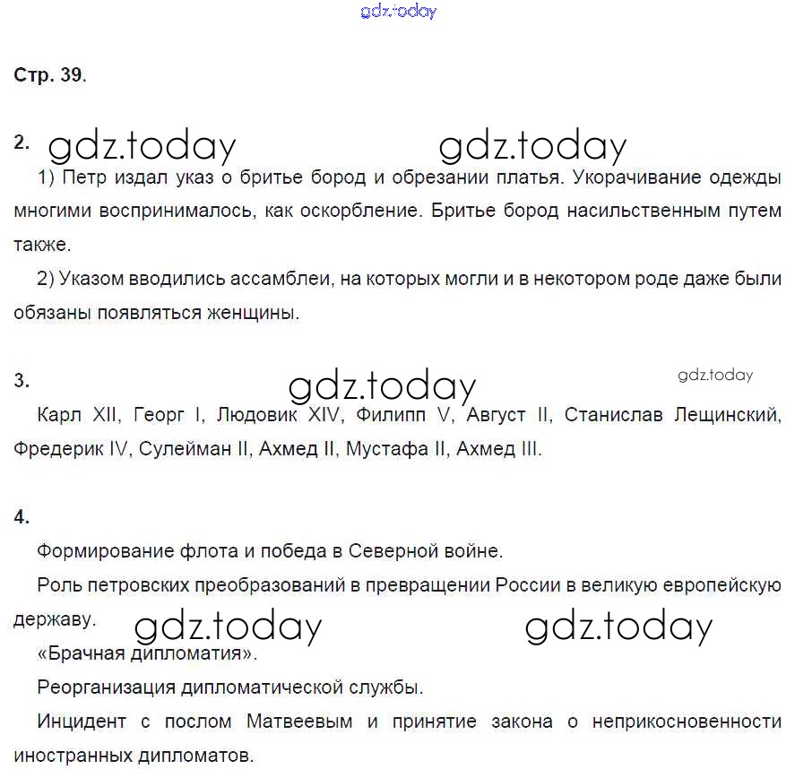 На страницах сайта gdz.today вы найдете учебный и вспомогательный материал, направленный на улучшения знаний школьной программы. ГДЗ - онлайн мир знаний Страницы (решение) 39 Рабочей тетради по Истории России для 8 класса Артасов, Данилов Просвещение УМК 2016