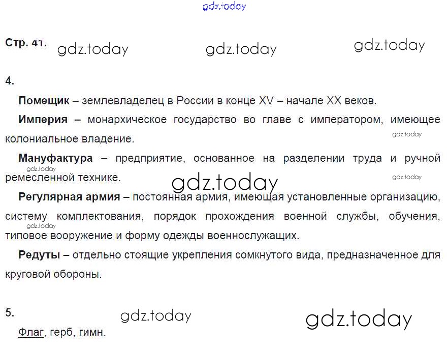 На страницах сайта gdz.today вы найдете учебный и вспомогательный материал, направленный на улучшения знаний школьной программы. ГДЗ - онлайн мир знаний Страницы (решение) 41 Рабочей тетради по Истории России для 8 класса Артасов, Данилов Просвещение УМК 2016