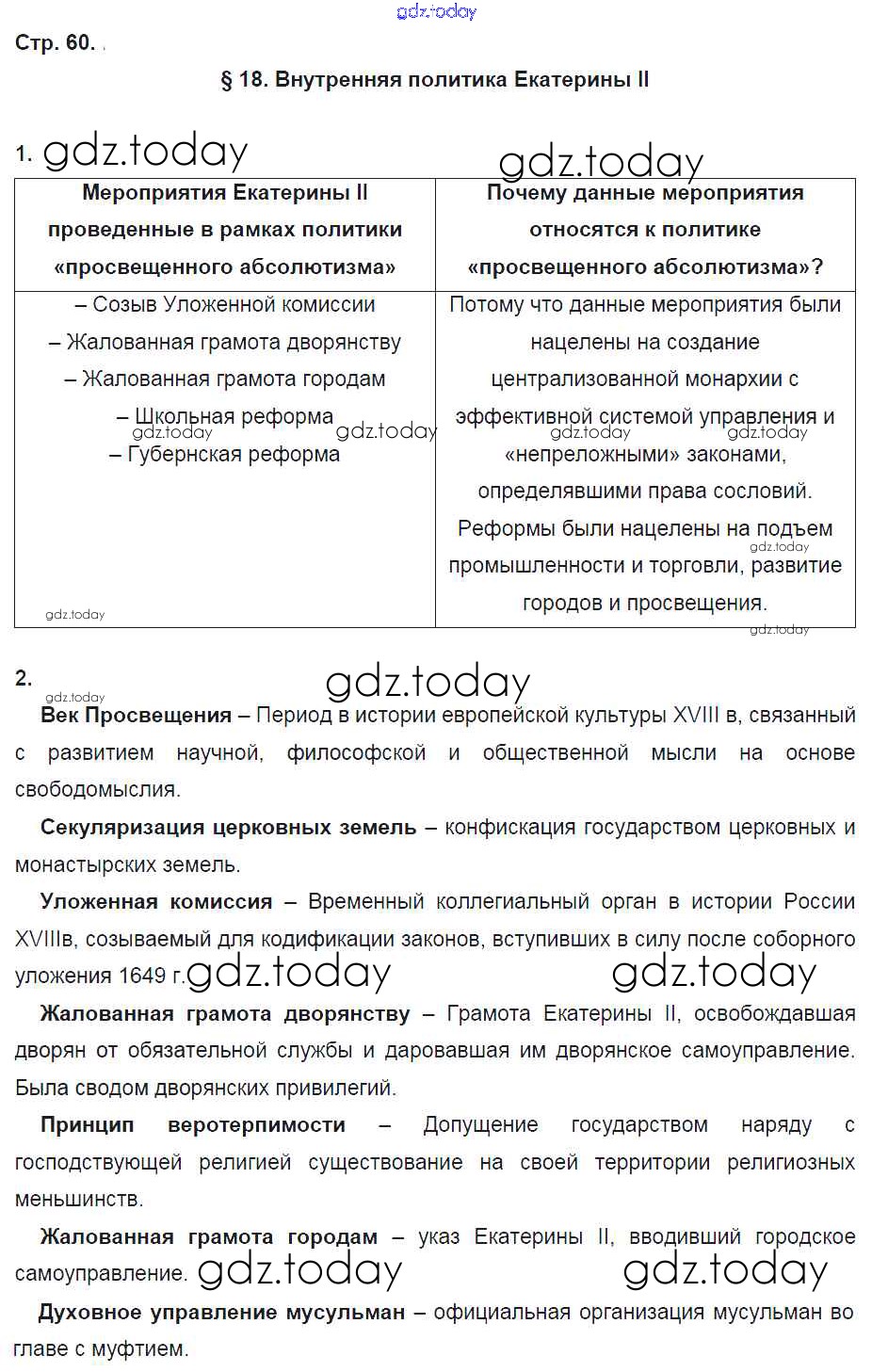 На страницах сайта gdz.today вы найдете учебный и вспомогательный материал, направленный на улучшения знаний школьной программы. ГДЗ - онлайн мир знаний Страницы (решение) 60 Рабочей тетради по Истории России для 8 класса Артасов, Данилов Просвещение УМК 2016