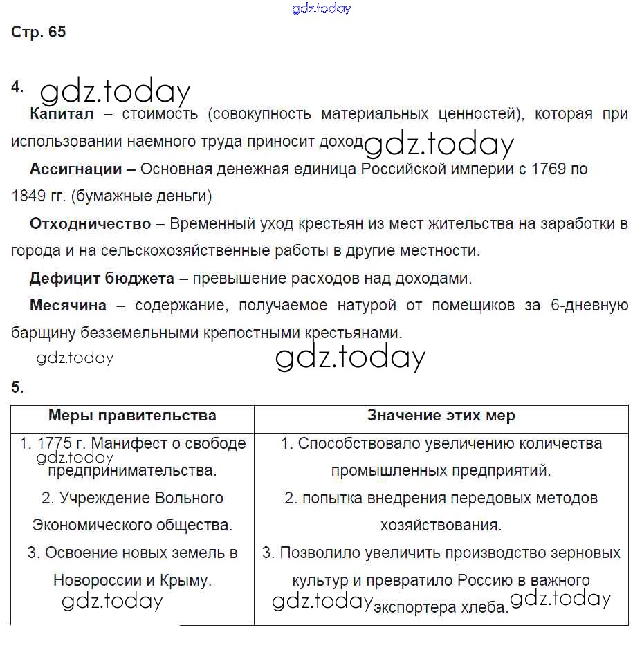 На страницах сайта gdz.today вы найдете учебный и вспомогательный материал, направленный на улучшения знаний школьной программы. ГДЗ - онлайн мир знаний Страницы (решение) 65 Рабочей тетради по Истории России для 8 класса Артасов, Данилов Просвещение УМК 2016