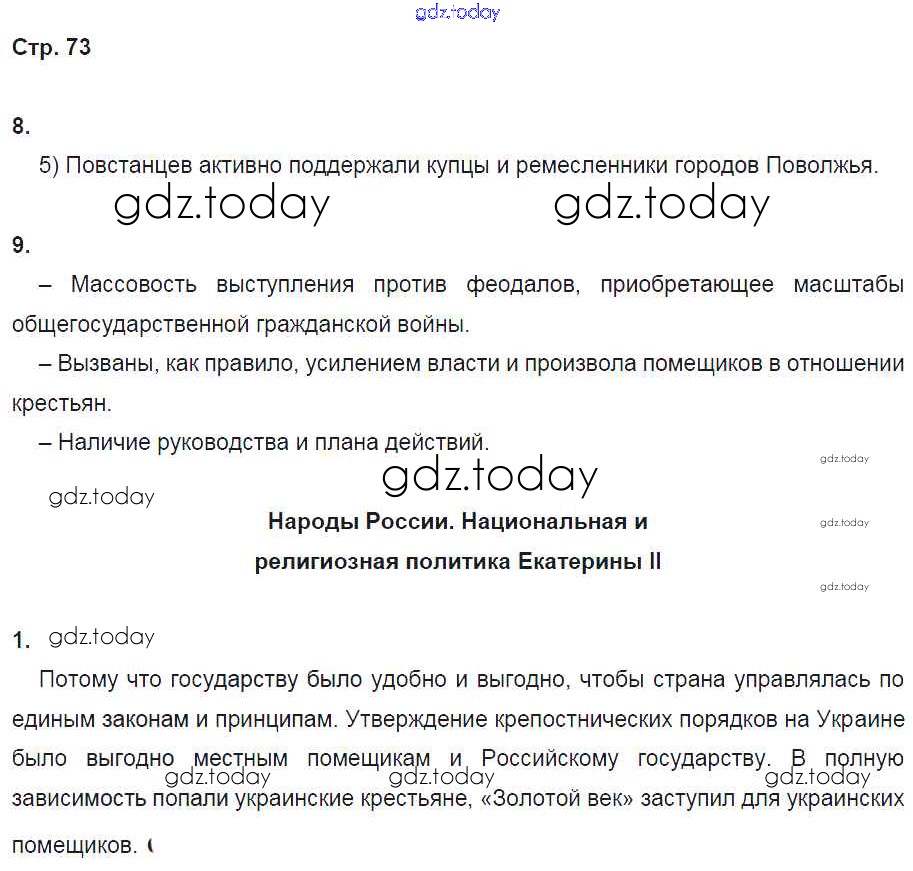 На страницах сайта gdz.today вы найдете учебный и вспомогательный материал, направленный на улучшения знаний школьной программы. ГДЗ - онлайн мир знаний Страницы (решение) 73 Рабочей тетради по Истории России для 8 класса Артасов, Данилов Просвещение УМК 2016