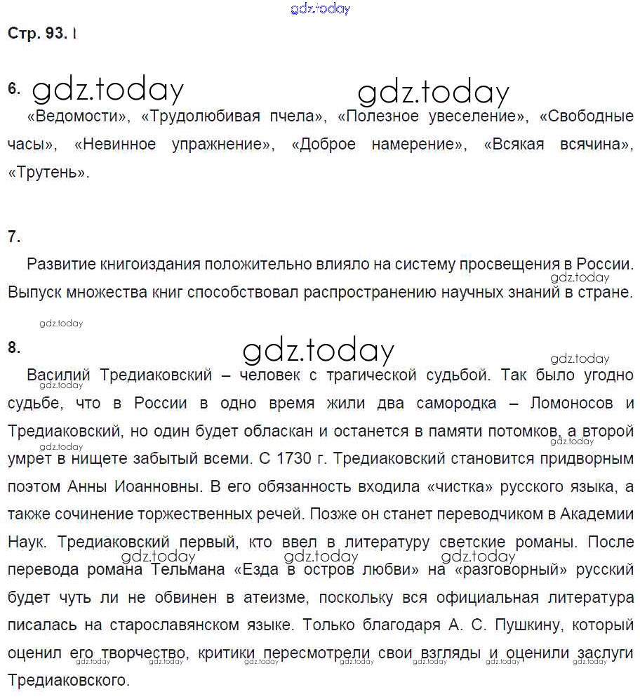 На страницах сайта gdz.today вы найдете учебный и вспомогательный материал, направленный на улучшения знаний школьной программы. ГДЗ - онлайн мир знаний Страницы (решение) 93 Рабочей тетради по Истории России для 8 класса Артасов, Данилов Просвещение УМК 2016