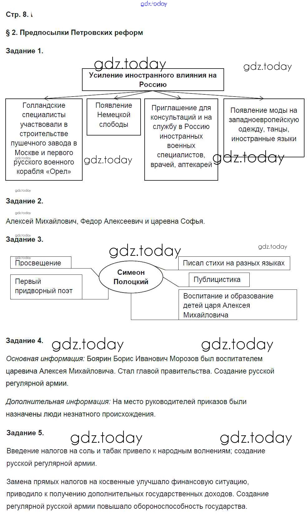 На страницах сайта gdz.today вы найдете учебный и вспомогательный материал, направленный на улучшения знаний школьной программы. ГДЗ - онлайн мир знаний Решение к части 1. Страницы 8 Рабочей тетради по Истории России для 8 класса Чернова Экзамен УМК 2017