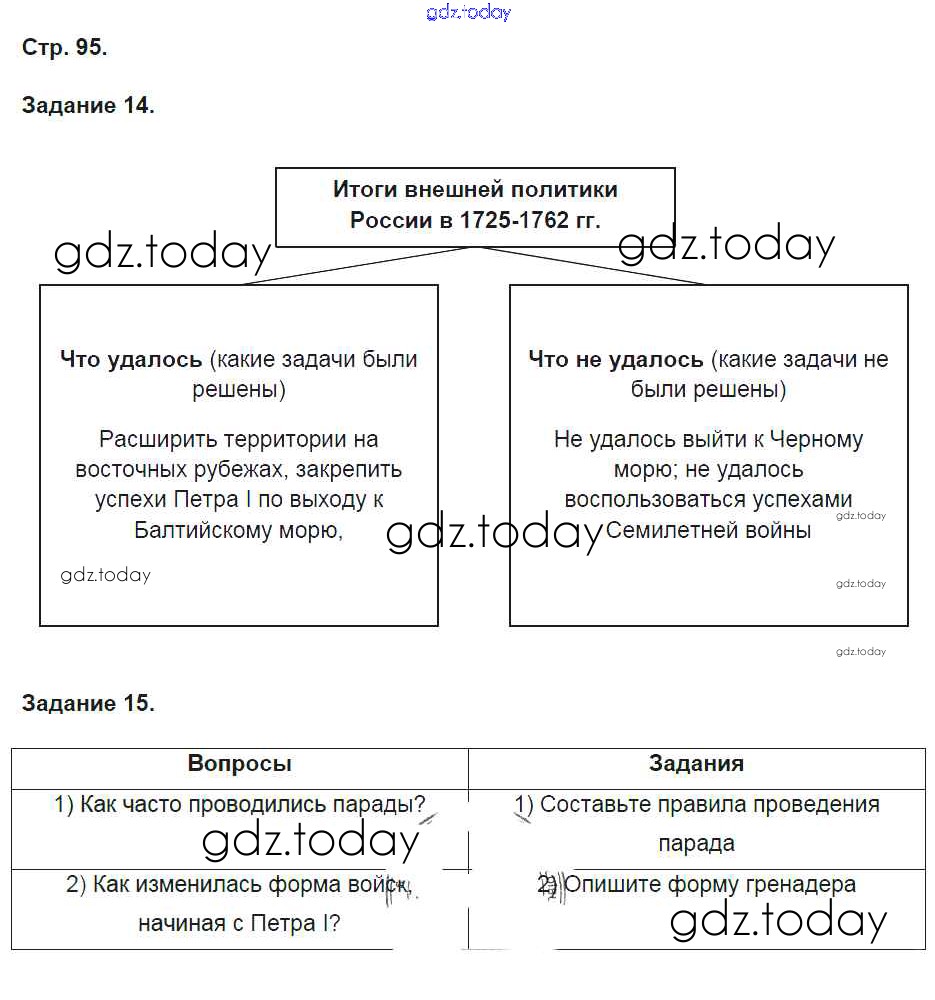 На страницах сайта gdz.today вы найдете учебный и вспомогательный материал, направленный на улучшения знаний школьной программы. ГДЗ - онлайн мир знаний Решение к части 1. Страницы 95 Рабочей тетради по Истории России для 8 класса Чернова Экзамен УМК 2017