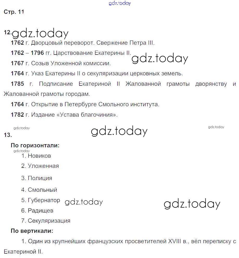 На страницах сайта gdz.today вы найдете учебный и вспомогательный материал, направленный на улучшения знаний школьной программы. ГДЗ - онлайн мир знаний Решение к части 2. Страницы 11 Рабочей тетради по Истории России для 8 класса Чернова Экзамен УМК 2017