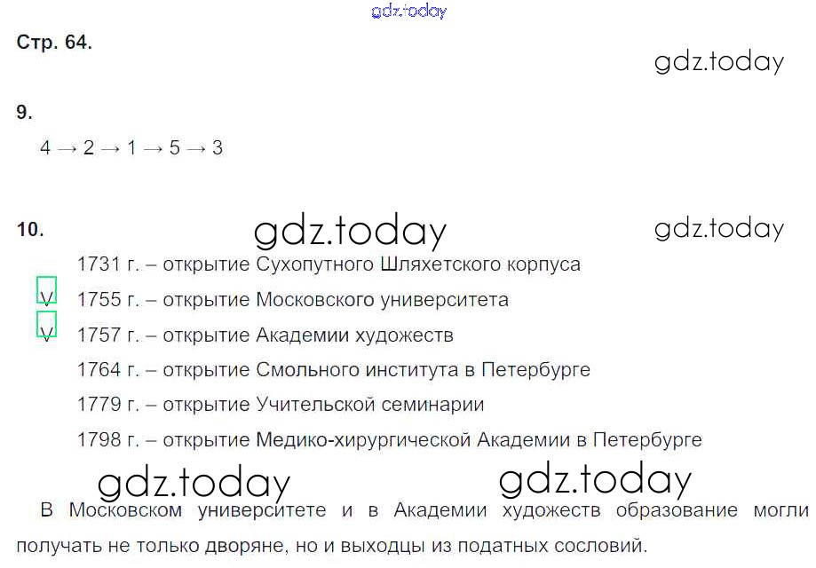 На страницах сайта gdz.today вы найдете учебный и вспомогательный материал, направленный на улучшения знаний школьной программы. ГДЗ - онлайн мир знаний Решение к части 2. Страницы 64 Рабочей тетради по Истории России для 8 класса Чернова Экзамен УМК 2017
