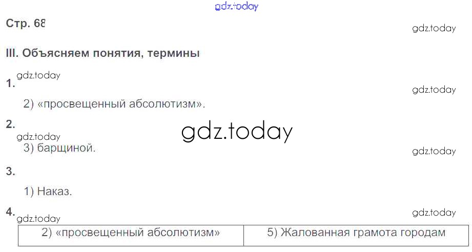 На страницах сайта gdz.today вы найдете учебный и вспомогательный материал, направленный на улучшения знаний школьной программы. ГДЗ - онлайн мир знаний Страницы (решение) 68 Рабочей тетради по Истории России для 8 класса Гевуркова Экзамен УМК 2018