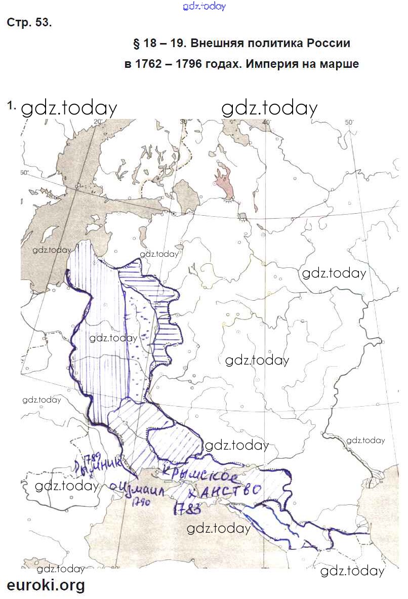 На страницах сайта gdz.today вы найдете учебный и вспомогательный материал, направленный на улучшения знаний школьной программы. ГДЗ - онлайн мир знаний Страницы (решение) 53 Рабочей тетради по Истории России для 8 класса Симонова, Клоков Дрофа УМК 2019