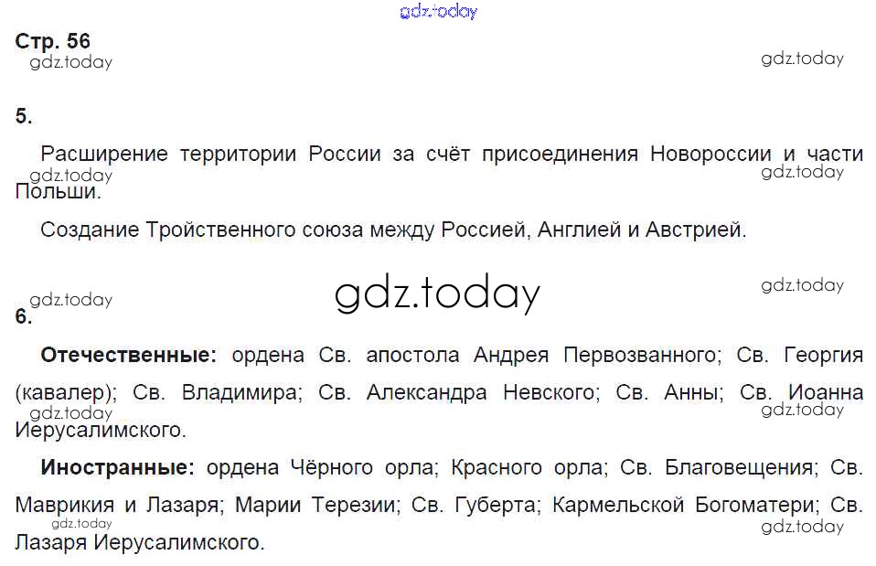 На страницах сайта gdz.today вы найдете учебный и вспомогательный материал, направленный на улучшения знаний школьной программы. ГДЗ - онлайн мир знаний Страницы (решение) 56 Рабочей тетради по Истории России для 8 класса Симонова, Клоков Дрофа УМК 2019