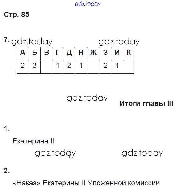 На страницах сайта gdz.today вы найдете учебный и вспомогательный материал, направленный на улучшения знаний школьной программы. ГДЗ - онлайн мир знаний Страницы (решение) 85 Рабочей тетради по Истории России для 8 класса Симонова, Клоков Дрофа УМК 2019