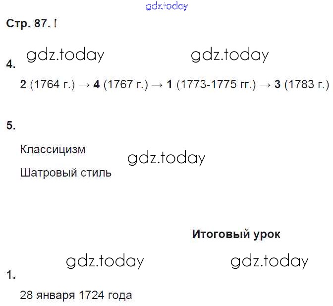 На страницах сайта gdz.today вы найдете учебный и вспомогательный материал, направленный на улучшения знаний школьной программы. ГДЗ - онлайн мир знаний Страницы (решение) 87 Рабочей тетради по Истории России для 8 класса Симонова, Клоков Дрофа УМК 2019
