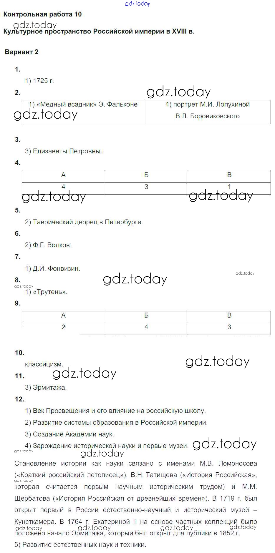 На страницах сайта gdz.today вы найдете учебный и вспомогательный материал, направленный на улучшения знаний школьной программы. ГДЗ - онлайн мир знаний Решение к контрольной работе 10. Варианты 2 Контрольным работам по Истории России для 8 класса Соловьев Экзамен УМК 2019