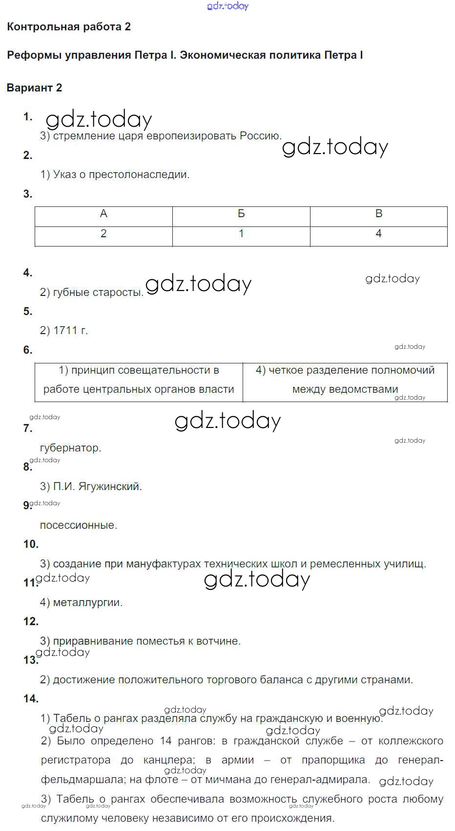 На страницах сайта gdz.today вы найдете учебный и вспомогательный материал, направленный на улучшения знаний школьной программы. ГДЗ - онлайн мир знаний Решение к контрольной работе 2. Варианты 2 Контрольным работам по Истории России для 8 класса Соловьев Экзамен УМК 2019