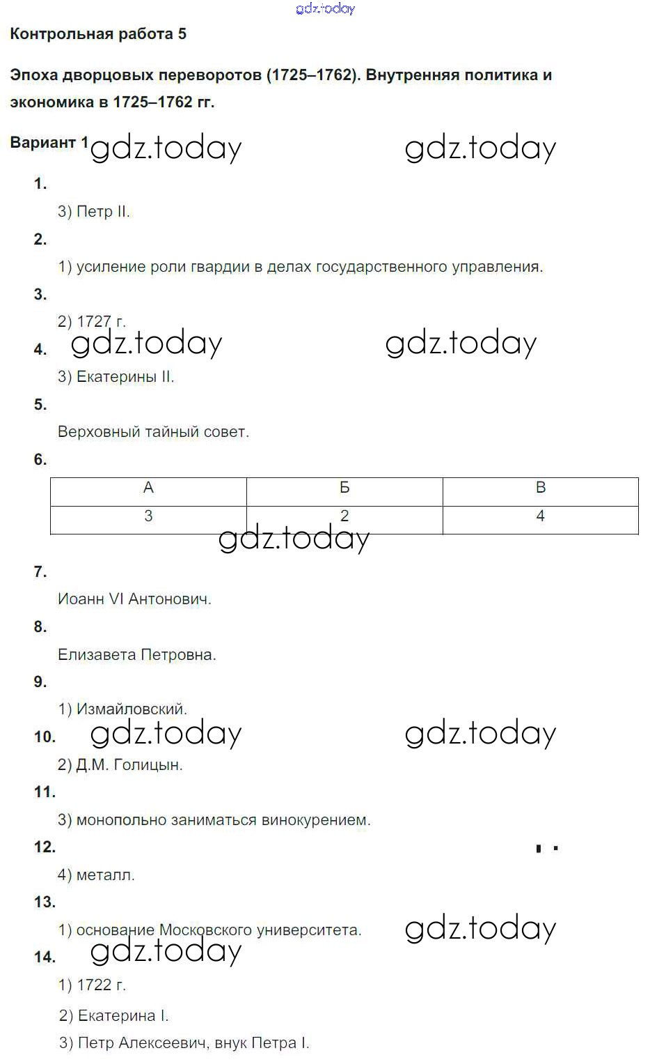 На страницах сайта gdz.today вы найдете учебный и вспомогательный материал, направленный на улучшения знаний школьной программы. ГДЗ - онлайн мир знаний Решение к контрольной работе 5. Варианты 1 Контрольным работам по Истории России для 8 класса Соловьев Экзамен УМК 2019