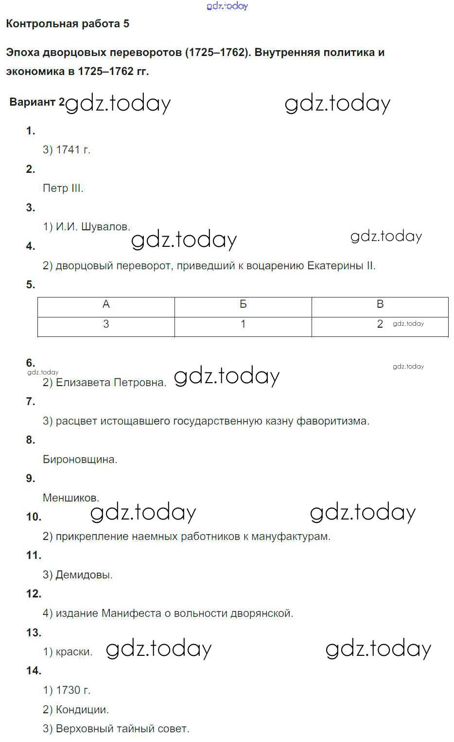 На страницах сайта gdz.today вы найдете учебный и вспомогательный материал, направленный на улучшения знаний школьной программы. ГДЗ - онлайн мир знаний Решение к контрольной работе 5. Варианты 2 Контрольным работам по Истории России для 8 класса Соловьев Экзамен УМК 2019