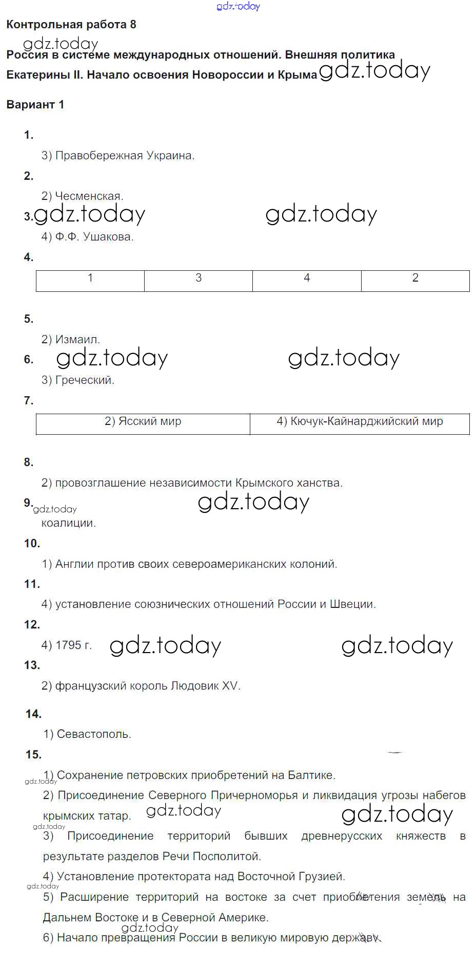 На страницах сайта gdz.today вы найдете учебный и вспомогательный материал, направленный на улучшения знаний школьной программы. ГДЗ - онлайн мир знаний Решение к контрольной работе 8. Варианты 1 Контрольным работам по Истории России для 8 класса Соловьев Экзамен УМК 2019