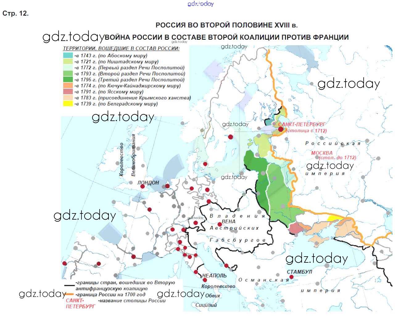 На страницах сайта gdz.today вы найдете учебный и вспомогательный материал, направленный на улучшения знаний школьной программы. ГДЗ - онлайн мир знаний Страницы (решение) 12 Контурным картам по Истории России для 8 класса Тороп Просвещение УМК 2017