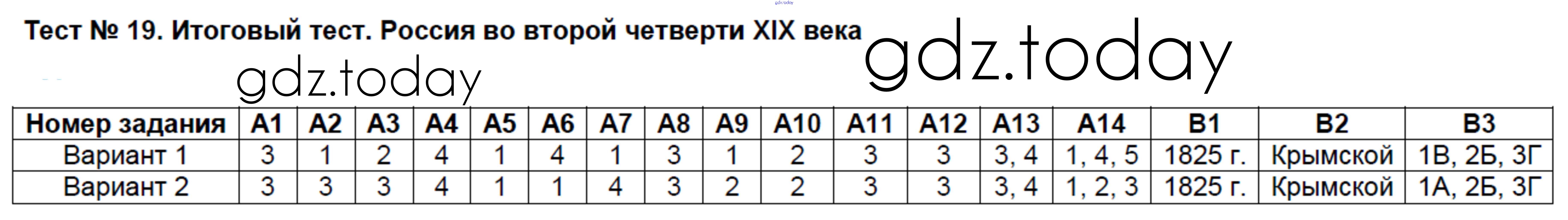 На страницах сайта gdz.today вы найдете учебный и вспомогательный материал, направленный на улучшения знаний школьной программы. ГДЗ - онлайн мир знаний Решение к тестам 19 Контрольно-измерительным материалам (КИМ) по Истории России для 8 класса Волкова ВАКО 2017