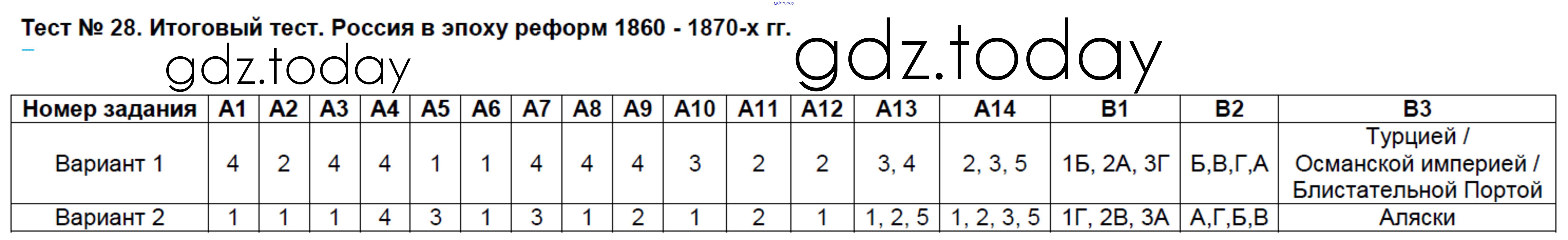 На страницах сайта gdz.today вы найдете учебный и вспомогательный материал, направленный на улучшения знаний школьной программы. ГДЗ - онлайн мир знаний Решение к тестам 28 Контрольно-измерительным материалам (КИМ) по Истории России для 8 класса Волкова ВАКО 2017