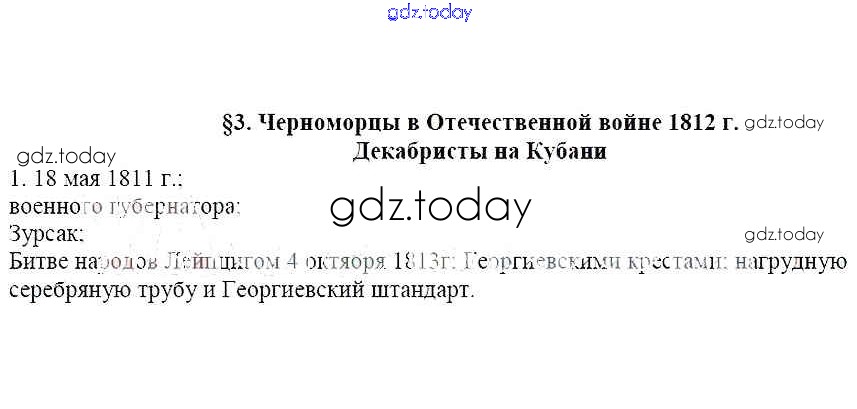 На страницах сайта gdz.today вы найдете учебный и вспомогательный материал, направленный на улучшения знаний школьной программы. ГДЗ - онлайн мир знаний Решение к § 3. Черноморцы в Отечественной войне 1812 г. Декабристы на Кубани 1 Рабочей тетради по Кубановедению для 8 класса Гриценко Перспективы образования 2018