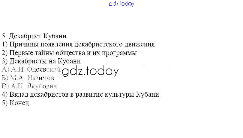 На страницах сайта gdz.today вы найдете учебный и вспомогательный материал, направленный на улучшения знаний школьной программы. ГДЗ - онлайн мир знаний Решение к § 3. Черноморцы в Отечественной войне 1812 г. Декабристы на Кубани 5 Рабочей тетради по Кубановедению для 8 класса Гриценко Перспективы образования 2018
