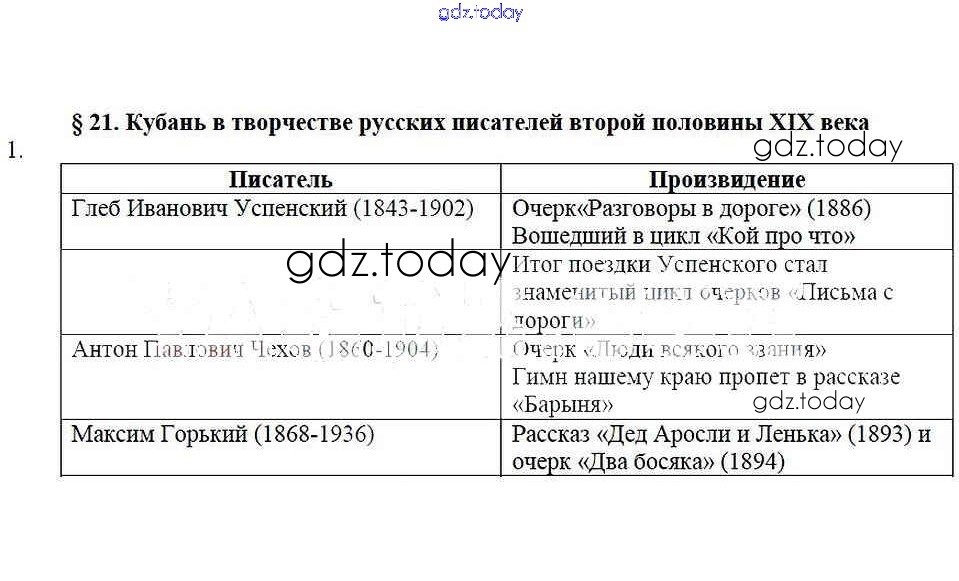 На страницах сайта gdz.today вы найдете учебный и вспомогательный материал, направленный на улучшения знаний школьной программы. ГДЗ - онлайн мир знаний Решение к § 21. Кубань в творчестве русских писателей второй половины XIX века 1 Рабочей тетради по Кубановедению для 8 класса Гриценко Перспективы образования 2018