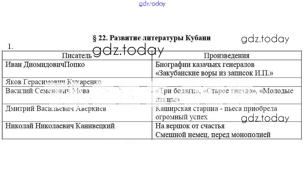 На страницах сайта gdz.today вы найдете учебный и вспомогательный материал, направленный на улучшения знаний школьной программы. ГДЗ - онлайн мир знаний Решение к § 22. Развитие литературы Кубани 1 Рабочей тетради по Кубановедению для 8 класса Гриценко Перспективы образования 2018
