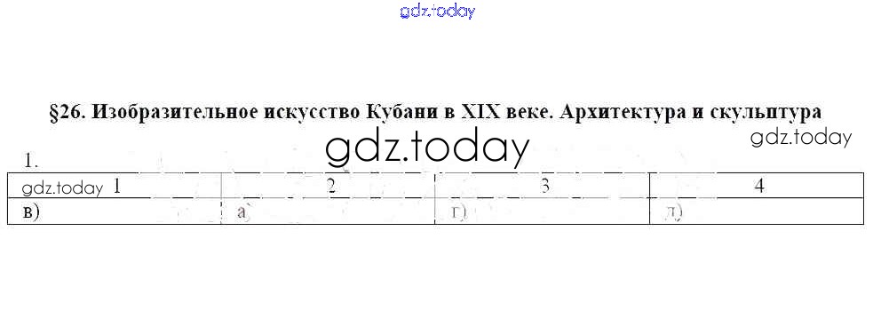 На страницах сайта gdz.today вы найдете учебный и вспомогательный материал, направленный на улучшения знаний школьной программы. ГДЗ - онлайн мир знаний Решение к § 26. Изобразительное искусство Кубани в XIX веке. Архитектура и скульптура 1 Рабочей тетради по Кубановедению для 8 класса Гриценко Перспективы образования 2018