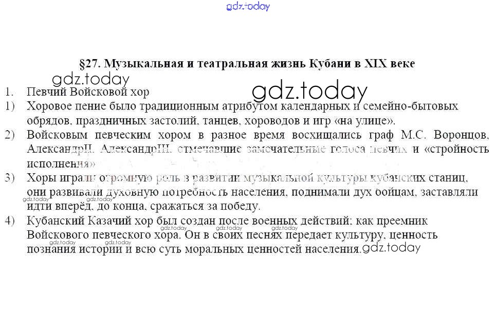На страницах сайта gdz.today вы найдете учебный и вспомогательный материал, направленный на улучшения знаний школьной программы. ГДЗ - онлайн мир знаний Решение к § 27. Музыкальная и театральная жизнь Кубани в XIX веке 1 Рабочей тетради по Кубановедению для 8 класса Гриценко Перспективы образования 2018