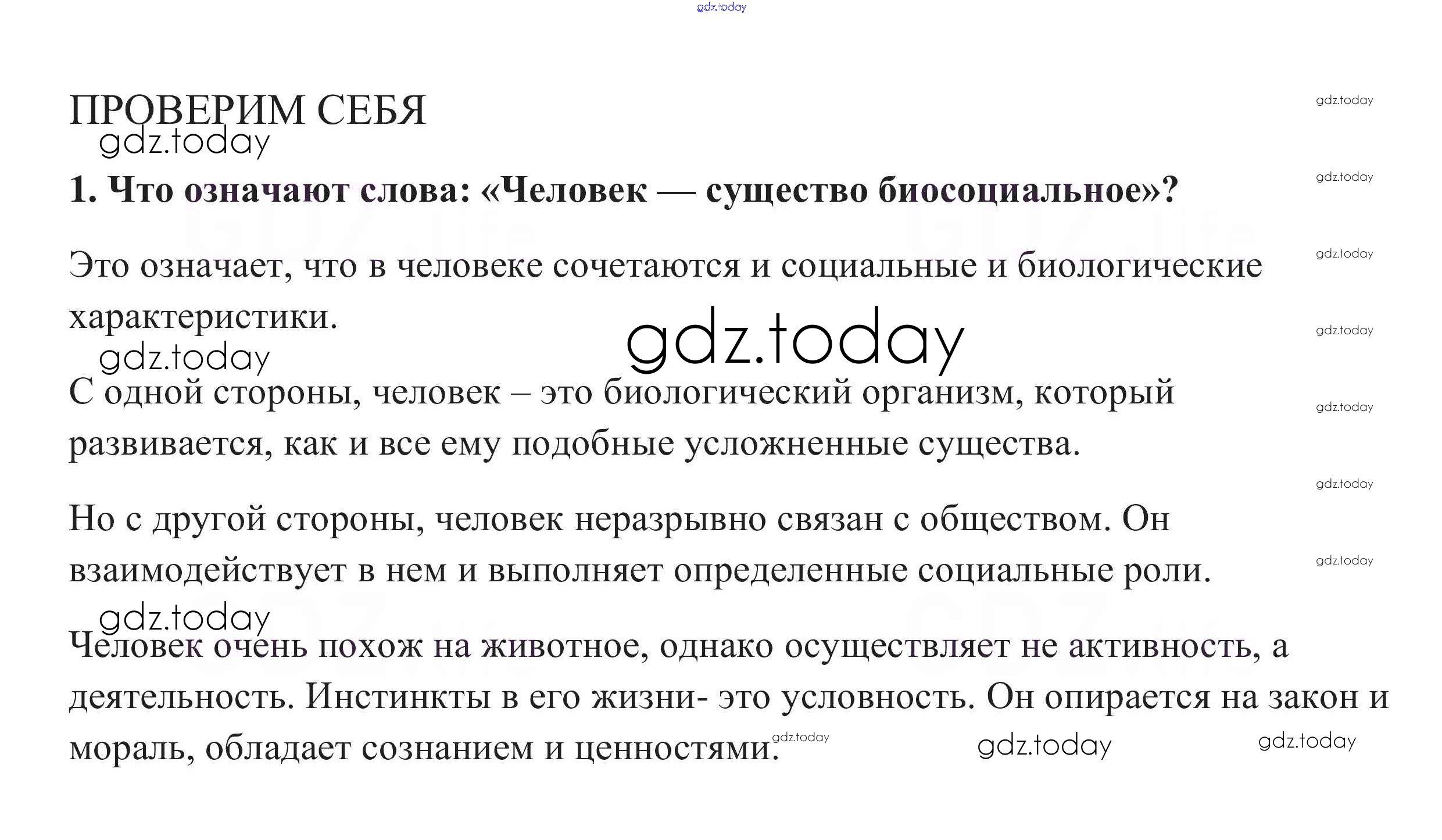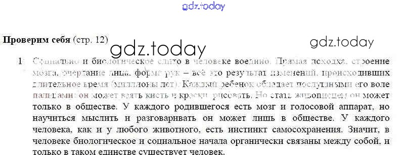 На страницах сайта gdz.today вы найдете учебный и вспомогательный материал, направленный на улучшения знаний школьной программы. ГДЗ - онлайн мир знаний Проверим себя §1. Что делает человека человеком 1 Учебнику по Обществознанию для 8 класса Боголюбов, Городецкая Просвещение Академический школьный учебник 2014