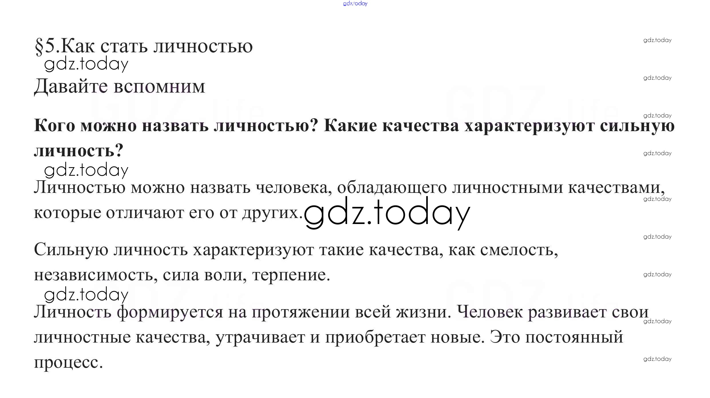 На страницах сайта gdz.today вы найдете учебный и вспомогательный материал, направленный на улучшения знаний школьной программы. ГДЗ - онлайн мир знаний Вспомним §5. Как стать личностью 1 Учебнику по Обществознанию для 8 класса Боголюбов, Городецкая Просвещение Академический школьный учебник 2014