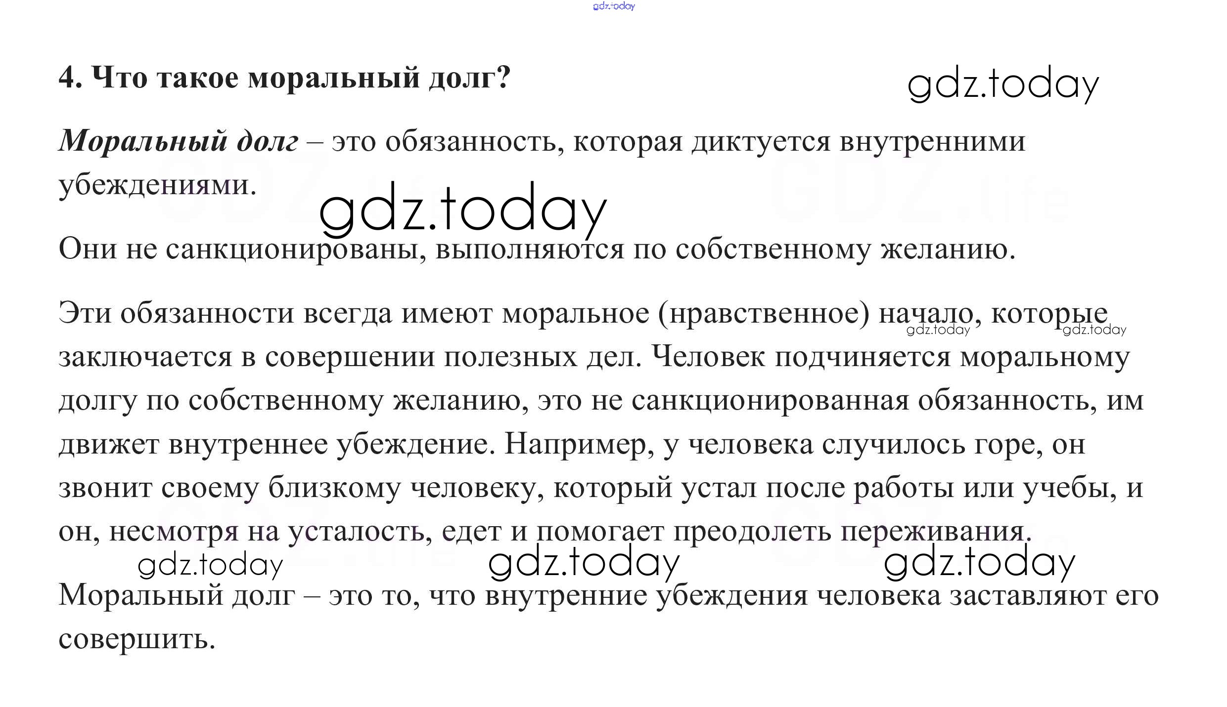 На страницах сайта gdz.today вы найдете учебный и вспомогательный материал, направленный на улучшения знаний школьной программы. ГДЗ - онлайн мир знаний Проверим себя §8. Долг и совесть 4 Учебнику по Обществознанию для 8 класса Боголюбов, Городецкая Просвещение Академический школьный учебник 2014