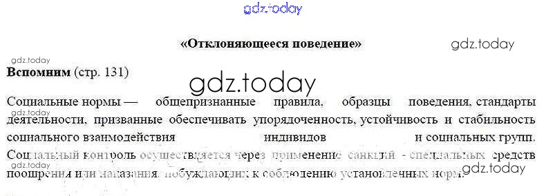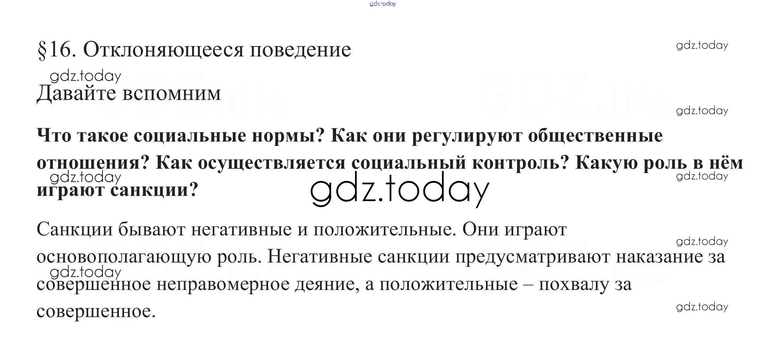На страницах сайта gdz.today вы найдете учебный и вспомогательный материал, направленный на улучшения знаний школьной программы. ГДЗ - онлайн мир знаний Вспомним §16. Отклоняющееся поведение 1 Учебнику по Обществознанию для 8 класса Боголюбов, Городецкая Просвещение Академический школьный учебник 2014