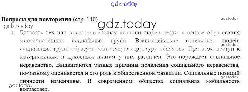 На страницах сайта gdz.today вы найдете учебный и вспомогательный материал, направленный на улучшения знаний школьной программы. ГДЗ - онлайн мир знаний Вопросы для повторения страница 140 Решение к главе 3. Социальная сфера 1 Учебнику по Обществознанию для 8 класса Боголюбов, Городецкая Просвещение Академический школьный учебник 2014