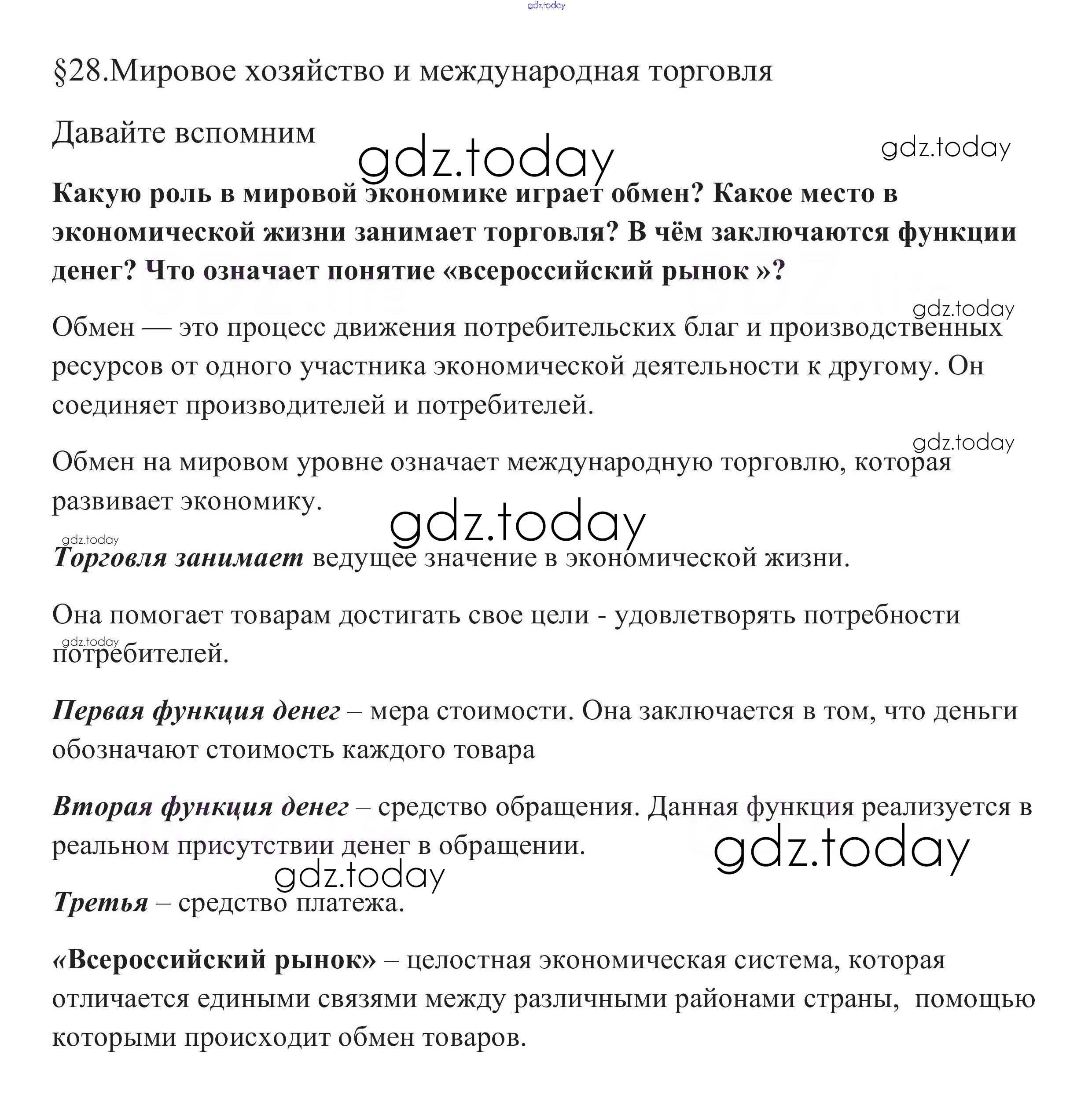 На страницах сайта gdz.today вы найдете учебный и вспомогательный материал, направленный на улучшения знаний школьной программы. ГДЗ - онлайн мир знаний Вопросы §28. Мировое хозяйство и международная торговля 1 Учебнику по Обществознанию для 8 класса Боголюбов, Городецкая Просвещение Академический школьный учебник 2014