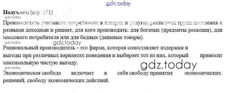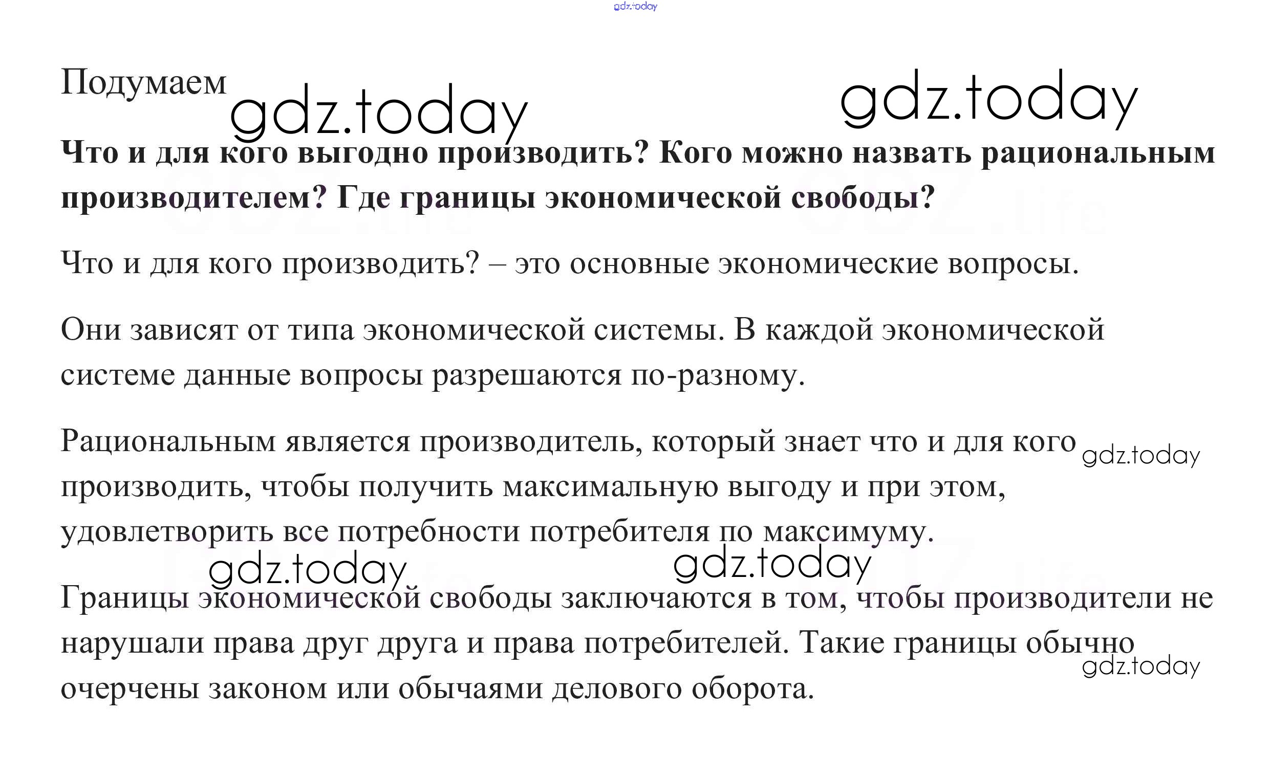 На страницах сайта gdz.today вы найдете учебный и вспомогательный материал, направленный на улучшения знаний школьной программы. ГДЗ - онлайн мир знаний Подумаем §18. Главные вопросы экономики 1 Учебнику по Обществознанию для 8 класса Боголюбов, Городецкая Просвещение Академический школьный учебник 2014