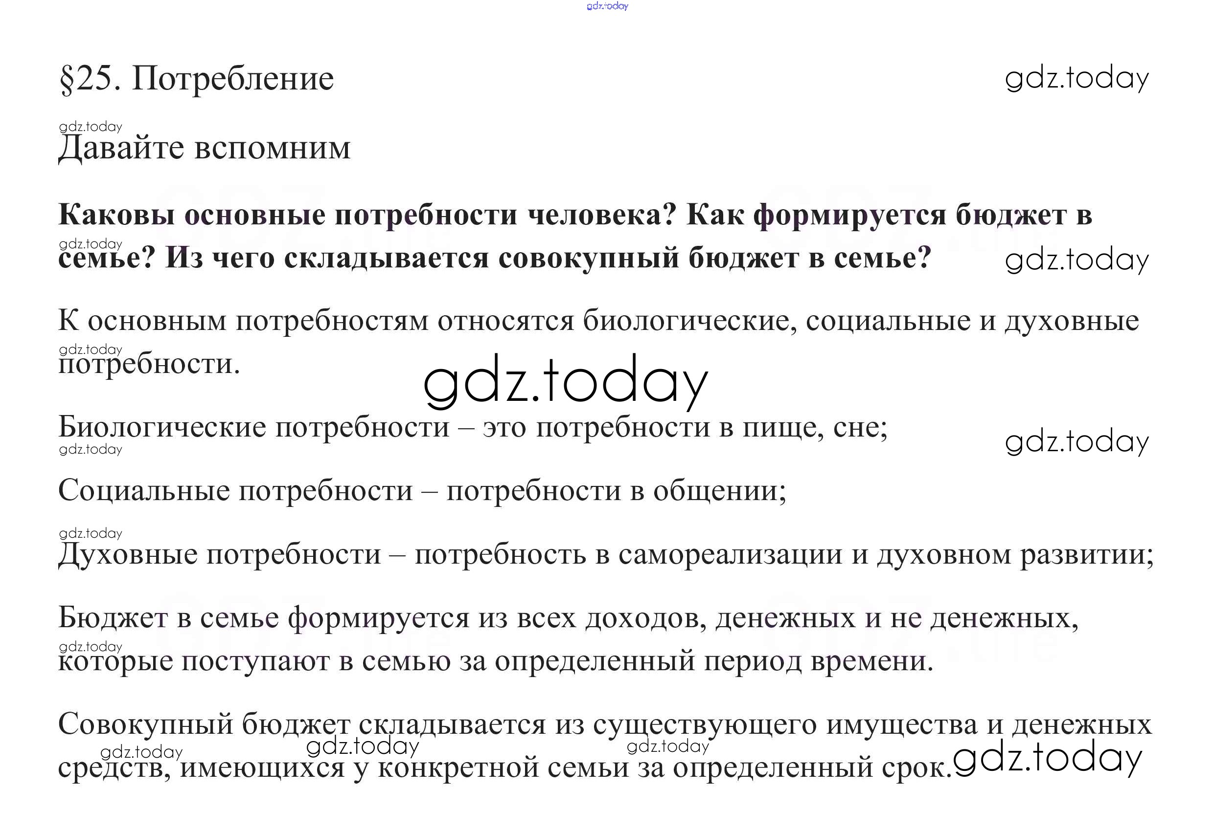 Ответы к Вспомним §25. Потребление 1 Учебнику по Обществознанию для 8 класса Боголюбов, Городецкая Просвещение Академический школьный учебник 2014