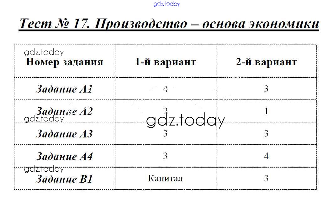 На страницах сайта gdz.today вы найдете учебный и вспомогательный материал, направленный на улучшения знаний школьной программы. ГДЗ - онлайн мир знаний Решение к тестам Тест №17. Производство - основа экономики Контрольно-измерительным материалам (КИМ) по Обществознанию для 8 класса Поздеев ВАКО 2017
