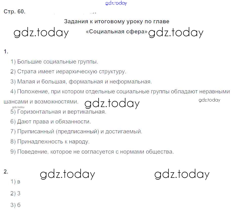 На страницах сайта gdz.today вы найдете учебный и вспомогательный материал, направленный на улучшения знаний школьной программы. ГДЗ - онлайн мир знаний Решение к глава 3. Социальная сфера стр.60 Рабочей тетради по Обществознанию для 8 класса Котова, Лискова Просвещение 2017