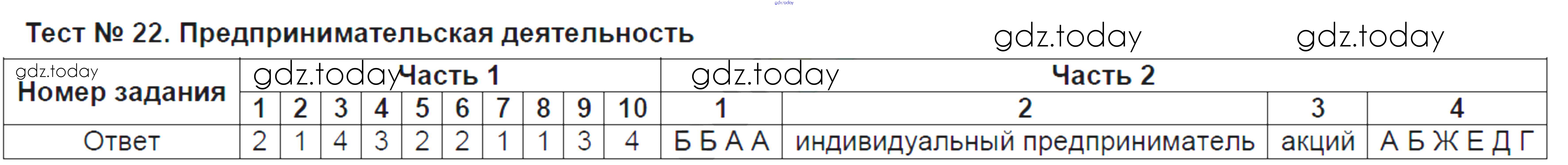 Ответы к Решение к тестам Тест №22. Предпринимательская деятельность Тестам по Обществознанию для 8 класса Краюшкина Экзамен УМК 2017